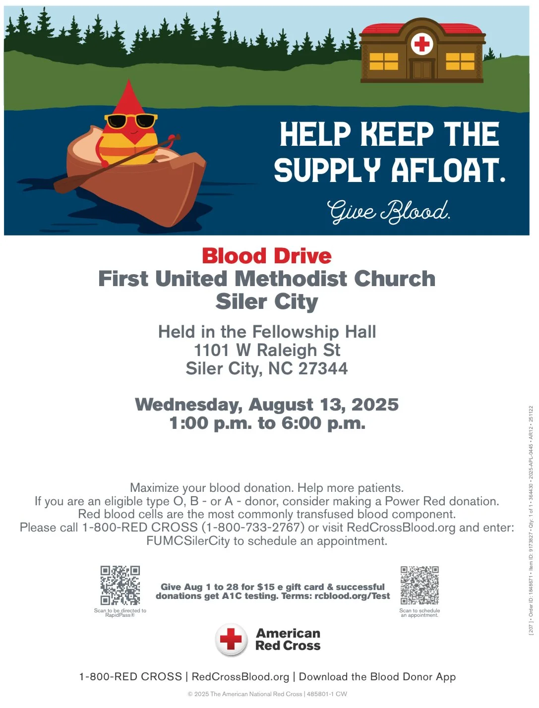 First United Methodist Church, Siler City is hosting their quarterly Blood drive in memory of those fallen during 9/11 and in honor of the Tunnel to Towers Foundation. To learn more about this organization visit, t2t.org.
