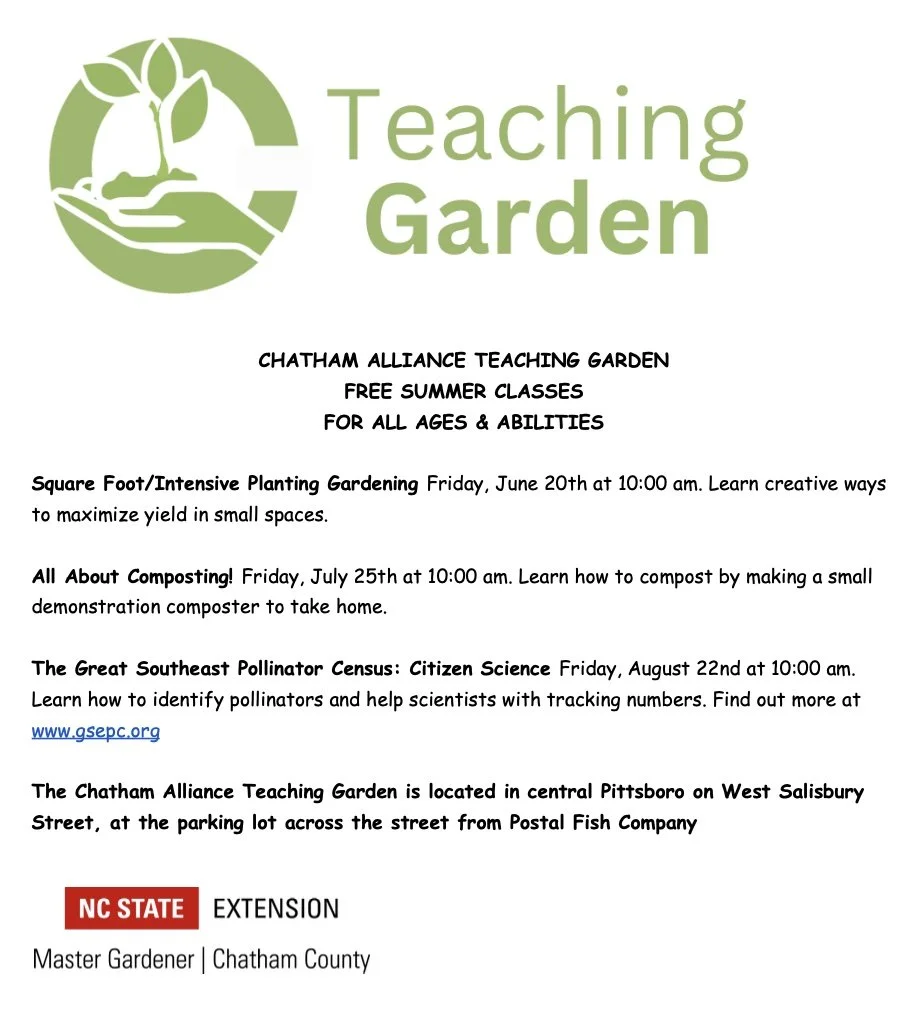 The Town of Pittsboro has invited Chatham Alliance to develop an Educational Demonstration Garden in the new Pop-Up-Park being developed on Salisbury Street in Pittsboro.
